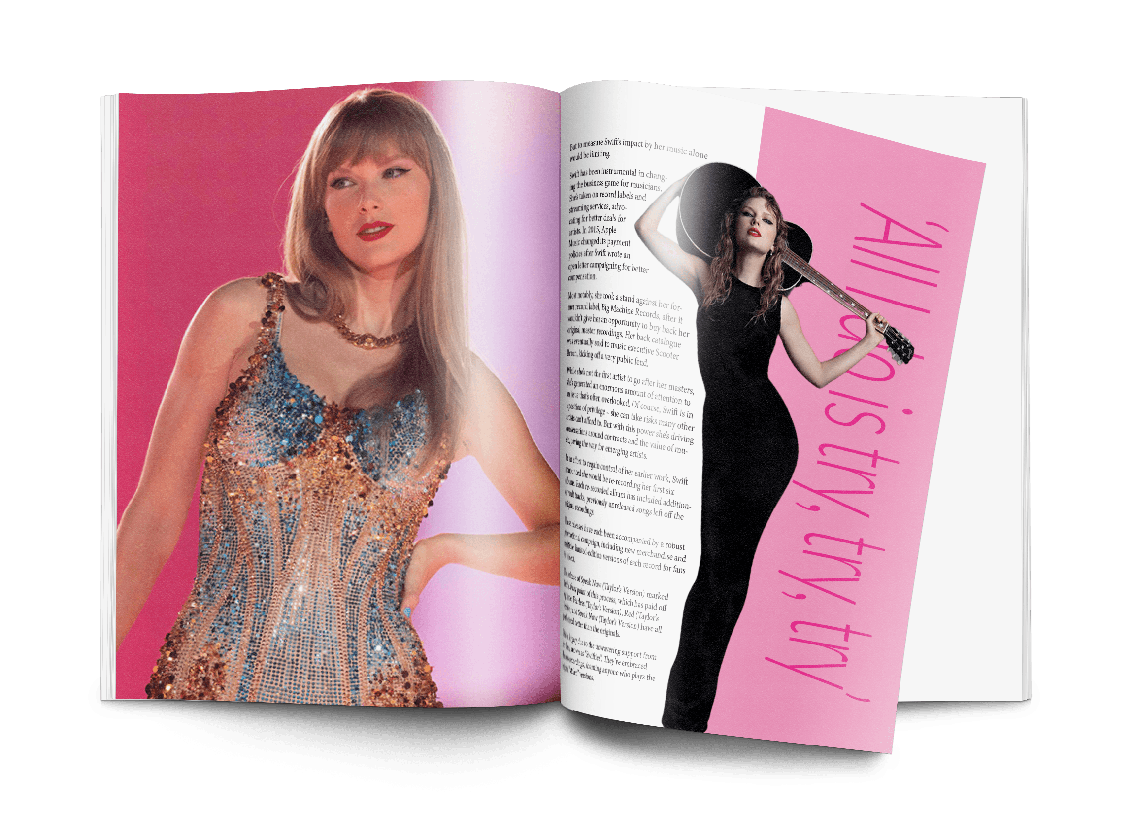 視覚的なストーリーテリング、タイポグラフィ、コンテンツフローを強調したクリーンでモダンなエディトリアルレイアウト。この特集はテイラー・スウィフトにスポットライトを当て、大胆なイメージとスタイリッシュで読みやすいデザインが融合しています。