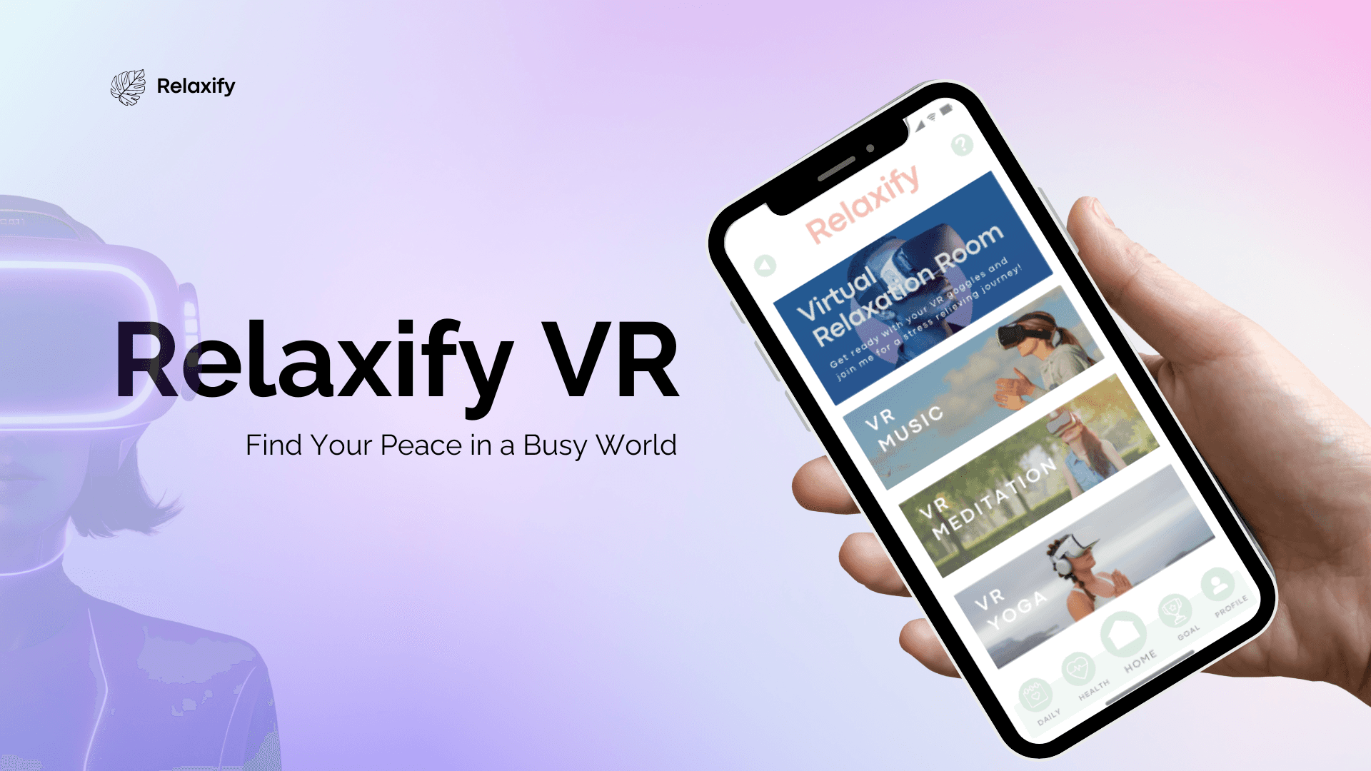 Relaxify is a VR wellness app designed to help users find peace in a busy world through guided meditation, immersive relaxation experiences, and breathing exercises.